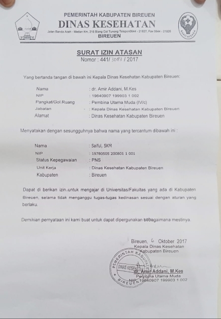 Ia menunjuk Surat Izin Atasan Nomor : 441/3083/2017 tertanggal 6 Oktober 2017 yang ditandatangani Kepala Dinas Kesehatan Kabupaten Bireuen, dr Amir Addani, MKes.
