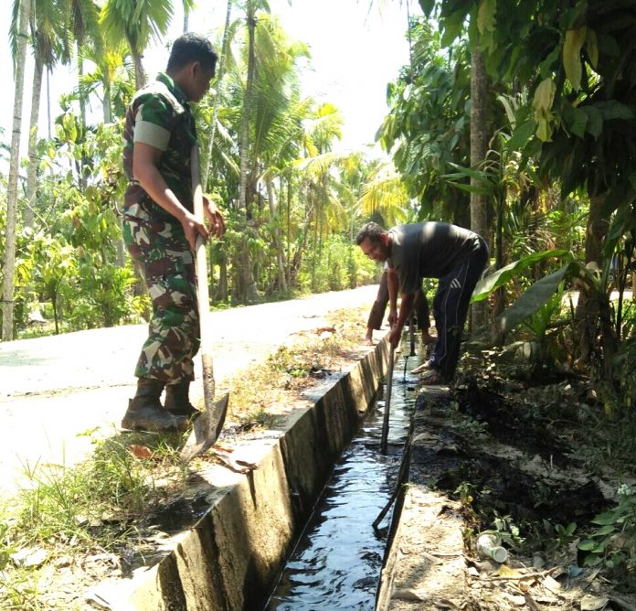 KABAR BIREUEN– Babinsa Koramil 09/Makmur Jajaran Kodim 0111/Bireuen Serda Erpin bersama masyarakat melaksanakan kegiatan karya bakti pembersihan saluran air di wilayah Desa Kuta Barat Kecamatan Makmur Kabupaten Bireuen, Rabu (11/4/2018).