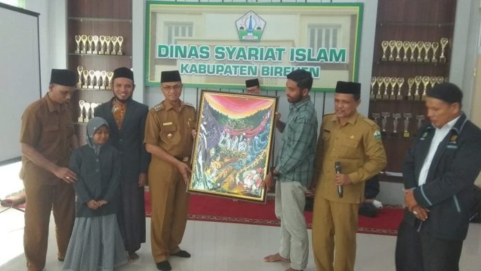 Dalam kegiatan itu, Bupati Bireuen Muzakar A.Gani, menerima kaligrafi kontemporer surat Ali Imran ayat 8, yang diserahkan oleh Muhammad Ajmal, (21), peserta cabang Kaligrafi.