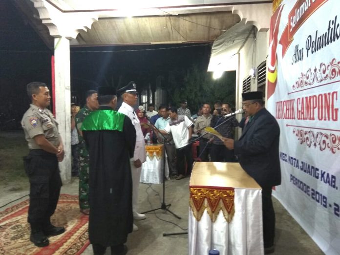 KABAR BIREUEN-Camat Kota Juang, Kabupaten Bireuen, Drs.Jalaluddin atas nama Bupati Bireuen melantik M.Nasir Abdullah sebagai Keuchik Gampong Cot Gapu, Kecamatan Kota Juang, masa jabatan 2019 – 2025, di halaman Meunasah Cot Gapu, Sen8n malam, 15 Juli 2019.