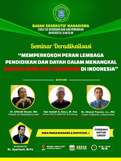 Hal itu diungkapkan Tgk. Iswadi Arsyad dalam materinya di acara seminar deradikalisasi bertema “Memperkokoh Peran Lembaga Pendidikan dan Dayah dalam Menangkal Radikalisme dan Terorisme di Indonesia”. Seminar tersebut dilaksanakan Badan Eksekutif Mahasiswa (BEM) Fakultas Keguruan dan Ilmu Pendidikan (FKIP) Universitas Almuslim (Umuslim) Peusangan, Bireuen, di Aula FKIP setempat, Sabtu (26/5/2018) sore.