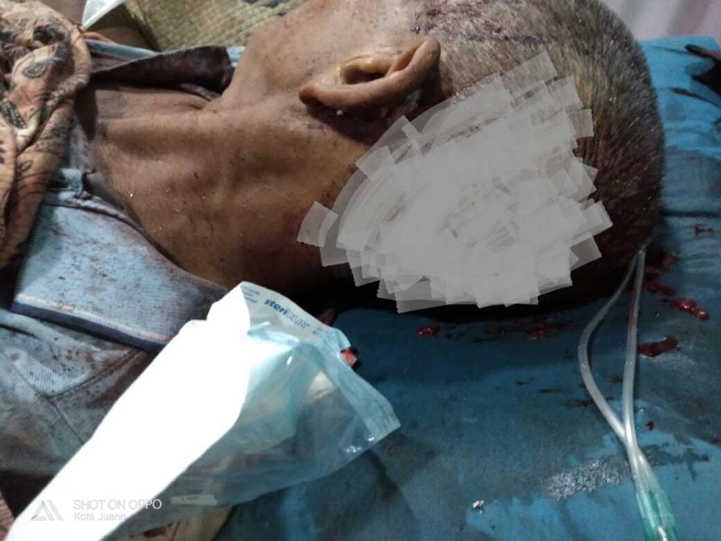 Tiba-tiba datang si buah hatinya. Seketika itu juga sabetan senjata tajam anaknya menebas bagian kepala sebelah kiri dekat telinga, sehingga korban menderita tiga luka robek.