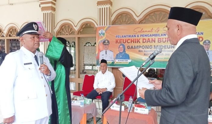 KABAR BIREUEN, Samalanga – Faisal Rizal BSc SH dilantik sebagai Keuchik Gampong Mideun Jok, Kecamatan Samalanga, Kabupaten Bireuen, periode 2025–2031. Prosesi pengambilan sumpah jabatan berlangsung di halaman meunasah setempat, Kamis (21/8/2025).