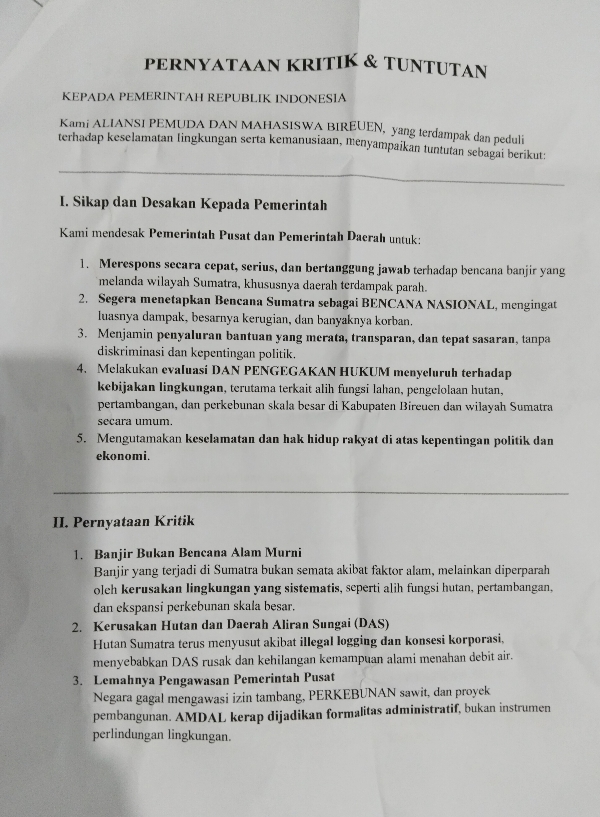 Dalam aksi tersebut, mereka mendesak pemerintah pusat agar menetapkan banjir bandang dan tanah longsor yang melanda sejumlah wilayah di Sumatra sebagai bencana nasional. Aliansi Pemuda dan Mahasiswa Bireuen juga menuntut penegakan hukum tegas terhadap pelaku kejahatan lingkungan yang diduga sebagai penyebab utama bencana.