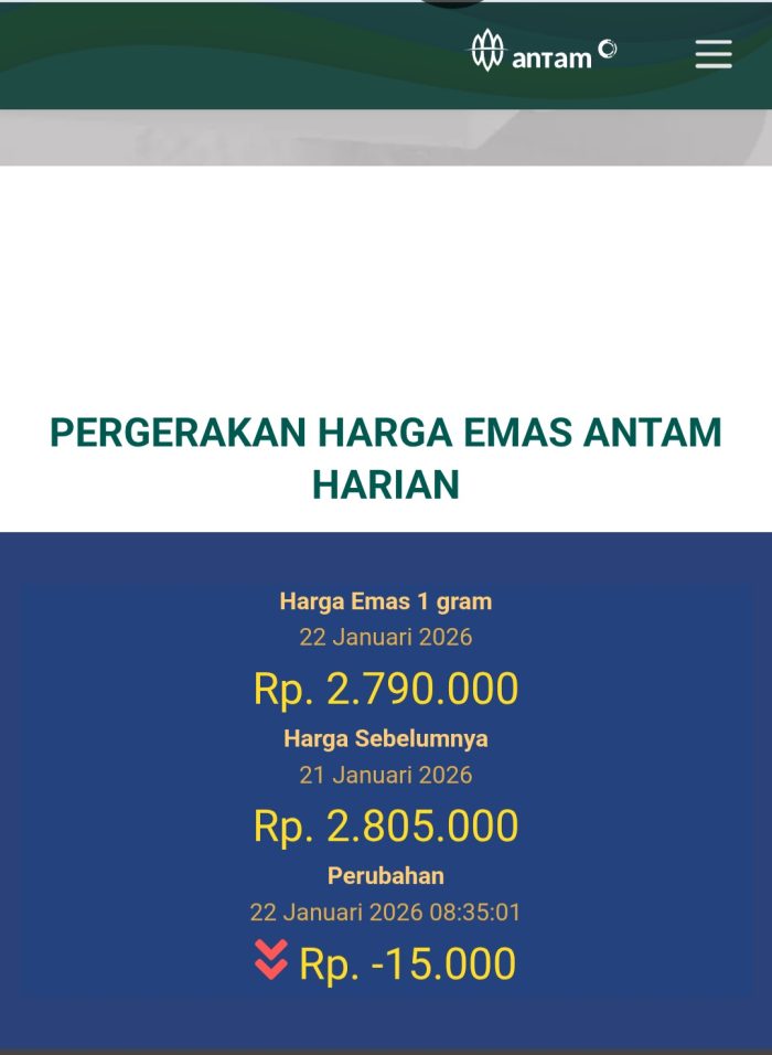Harga emas Antam hari ini turun setelah memecahkan rekor level tertinggi sepanjang sejarah alias all time high (ATH). Harga emas Antam 24 karat turun Rp 15.000 ke level Rp 2.790.000 per gram.