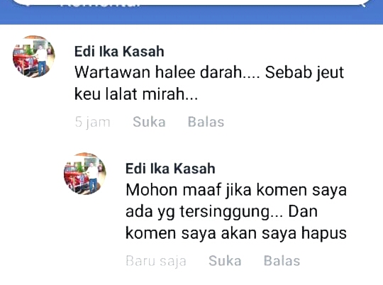 KABAR BIREUEN- Komentar Edi Ika Kasah melalui akun facebook miliknya yang menyebutkan ‘Wartawan halee darah…. Sebab Jeut Keu lalat mirah… menimbulkan kecaman dari komunitas wartawan Bireuen.