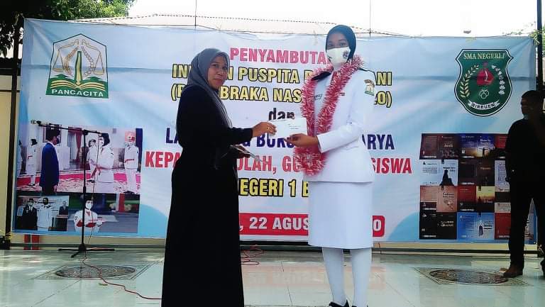KABAR BIREUEN-Halim Thomas, Ketua alumni SMA Negeri 1 Tahun 94 (SMANSA 94) Bireuen, diwakili Humas Smansa 94, Ernawati SE menyerahkan bonus prestasi kepada duta Aceh asal Bireuen, Indrian Puspita Rahmadhani siswi kelas XII Mipa II SMAN 1 Bireuen.