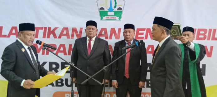 KABAR BIREUEN, Bireuen–Bupati Bireuen, Ir. Mukhlis, S.T., secara resmi melantik dan mengambil sumpah/janji jabatan Ismunandar, S.T., M.T., sebagai Sekretaris Daerah (Sekda) Bireuen, dalam sebuah prosesi yang berlangsung di Oproom Kantor Bupati Bireuen, Senin (20/4/2026).