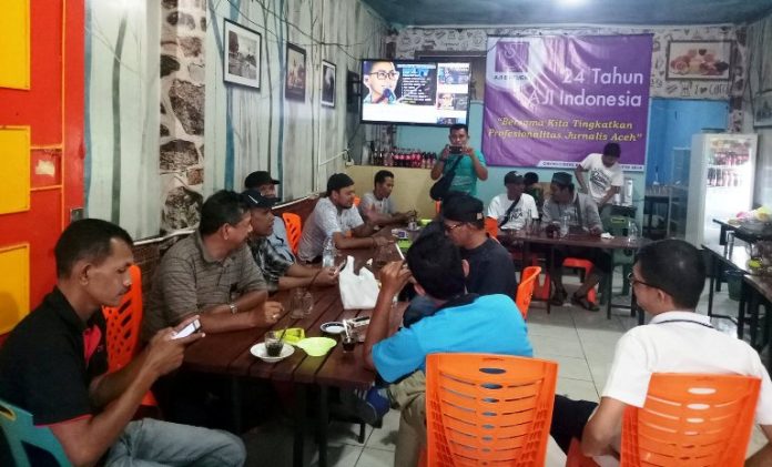 KABAR BIREUEN – Menyambut HUT Aliansi Jurnalis Independen (AJI) Indonesia ke-24, AJI Bireuen menggelar syukuran yang dirangkai dengan diskusi dan silaturahmi bersama wartawan setempat di Giring-giring Kupi, Bireuen, Selasa (7/8/2018) sore.