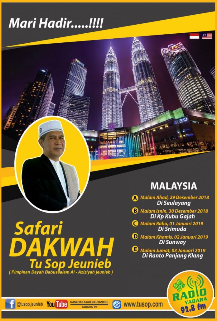 Berikut ini Jadwal Kegiatan Tu Sop di Malaysia, Sabtu malam, (29/12/2018), silaturahmi Aceh Peduli, Pengajian Tastafi dan zikir Akbar di Surau Sri Muda Selayang. Minggu malam, (30/12/2018), tausiyah di Kampung Kubu Gajah.