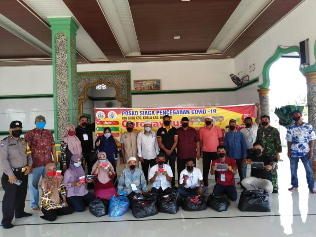 KABAR BIREUEN-Tim Satuan Tugas Relawan Gampong Lawan Covid-19 Desa Cot Kuta, Kecamatan Kuala, Kabupaten Bireuen bersama keuchik, perangkat gampong dan muspika Kecamatan Kuala membagikan masker kepada warga.