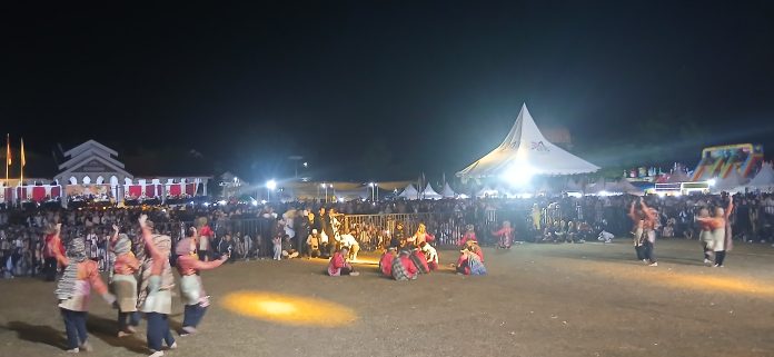 Tarian kolosal itu diiringi pengantar dan syair. Penampilan mereka mendapat aplaus dari penonton. (Ihkwati).