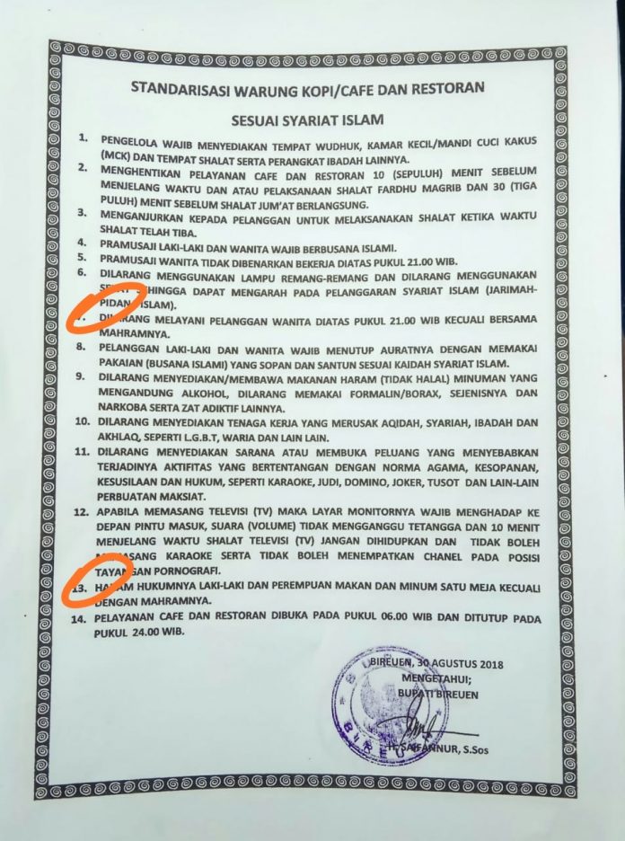 Standarisasi yang dikeluarkan tersebut tertanggal 30 Agustus 2018, ditandatangani Bupati Bireuen, H Saifannur S.Sos. Ada 14 poin dalam standarisasi tersebut.