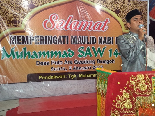 Demikian antara lain Tgk Muhammad Saidi Ilyas, Da’I dari Teupin Mane, Kecamatan Juli alumnus Dayah Abu Tumin Blang Bladeh mengajak umat Islam dalam menyampaikan dakwah peringatan Maulid Nabi Besar Muhammad SAW di Masjid Al Amin Pulo Ara, Kota Juang, Sabtu malam (5/1/2019).