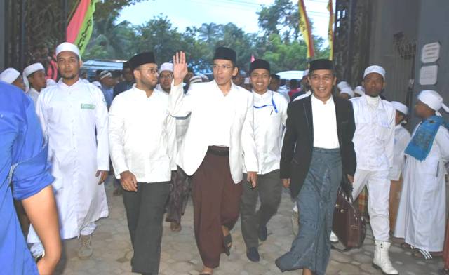 Gubernur NTB ditemani Pimpinan Dayah Babussalam Al-Aziziyah, Jeunieb, Tgk H Muhammad Yusuf A. Wahab (Tu Sop) disambut ratusan santri dan masyarakat saat tiba di dayah tersebut