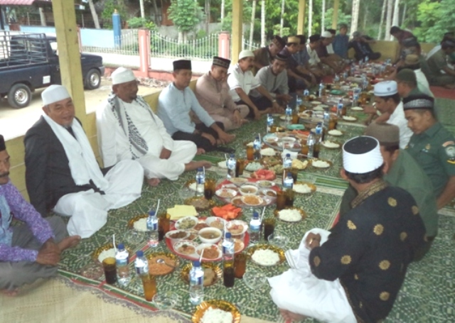 Bupati H Saifannur, Dandim-0111/Bireuen Letkol Amrul Huda, SE, M.Sc, Wakil Ketua MPU Tgk H Jamaluddin Idris bersama tim Safari Ramadhan, duduk bersimpuh di sebuah balai masjid berbuka puasa dengan masakan makanan khas Aceh. (H.AR Djuli).
