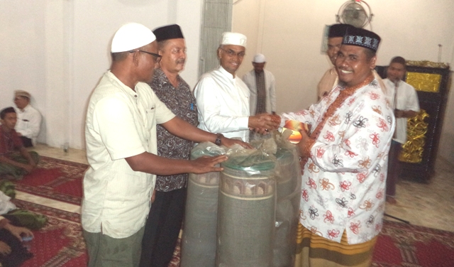 Pada kesempatan itu, Wabup Muzakkar didamping Camat Salahuddin,SPd menyerahkan bungong jaroe berusa tiga gulung panjang sajadah dan satu unit sirene untuk Masjid Babul Falah diterima Imum Chiek Tgk Muntasir.