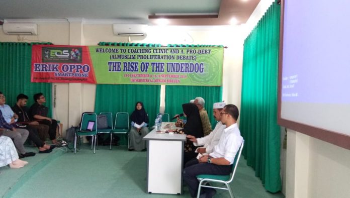 KABAR BIREUEN-Universitas Almuslim Peusangan Bireuen mengelar debat dan coaching clinic Bahasa Inggris, di ruang seminar Ampon Chiek Peusangan kampus setempat.
