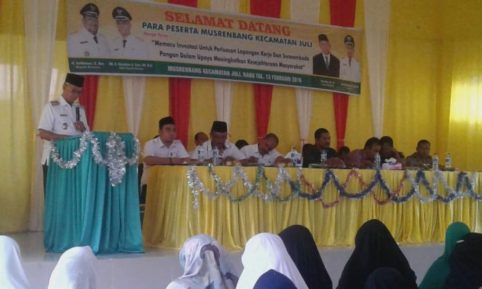 Sebelumnya Camat Juli, Doli Mardian SE,M.S.M, dalam inti laporannya menjelaskan, Musrembang dengan tema Memacu Investasi Untuk Perluasan Lapangan Kerja Dan Swasembada Pangan Dalam Upaya Meningkatkan Kesejahteraan Masyarakat, diharapkan Pemerintah Kabupaten kiranya dapat membantu sepenuhnya pelaksanaan pembangunan yang ada di Kecamatan Juli.